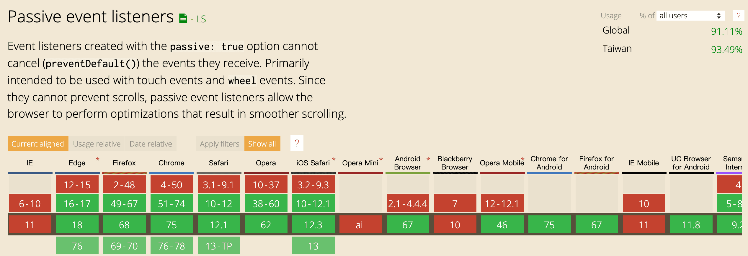 這個選項常用於一些避免網頁無法正常瀏覽的事件類型,例如:scroll,wheel等,以下是使用場景: