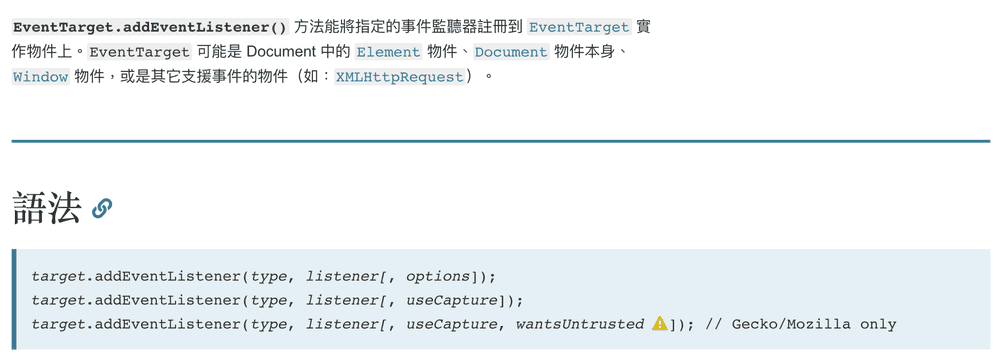 根據MDN文件的記載,綁定監聽事件的選項總共有3+1個屬性,分別為capture、once、passive以及mozSystemGroup,本文暫時只收錄前面三項,以下各自介紹其應用情境。