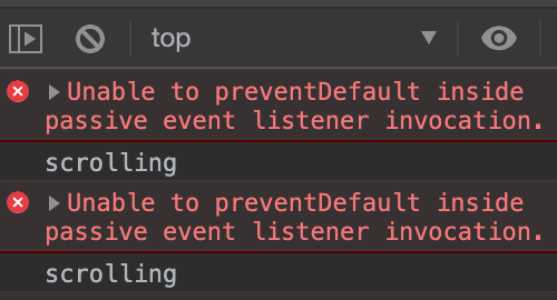 相對於前面兩個使用上較常見的選項,passive(在我的經驗上)則較少使用,passive用於避免對象的原生事件被阻止,並且當事件中偵測到使用event.preventDefault()阻止原生事件時,會報錯。