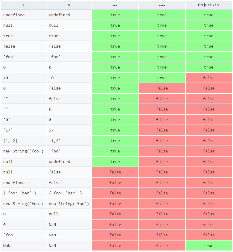 ==會自動轉換型別進行比較,結果較不直觀。===會先比較型別再進行值比較,結果較直觀,但仍會有NaN與+0,-0特例。目前開發最常用的相等比較符。Object.is()是ES6加入的「等值比較符」,連NaN與+0,-0都能準確比較,但寫法不直觀,尚未流行。