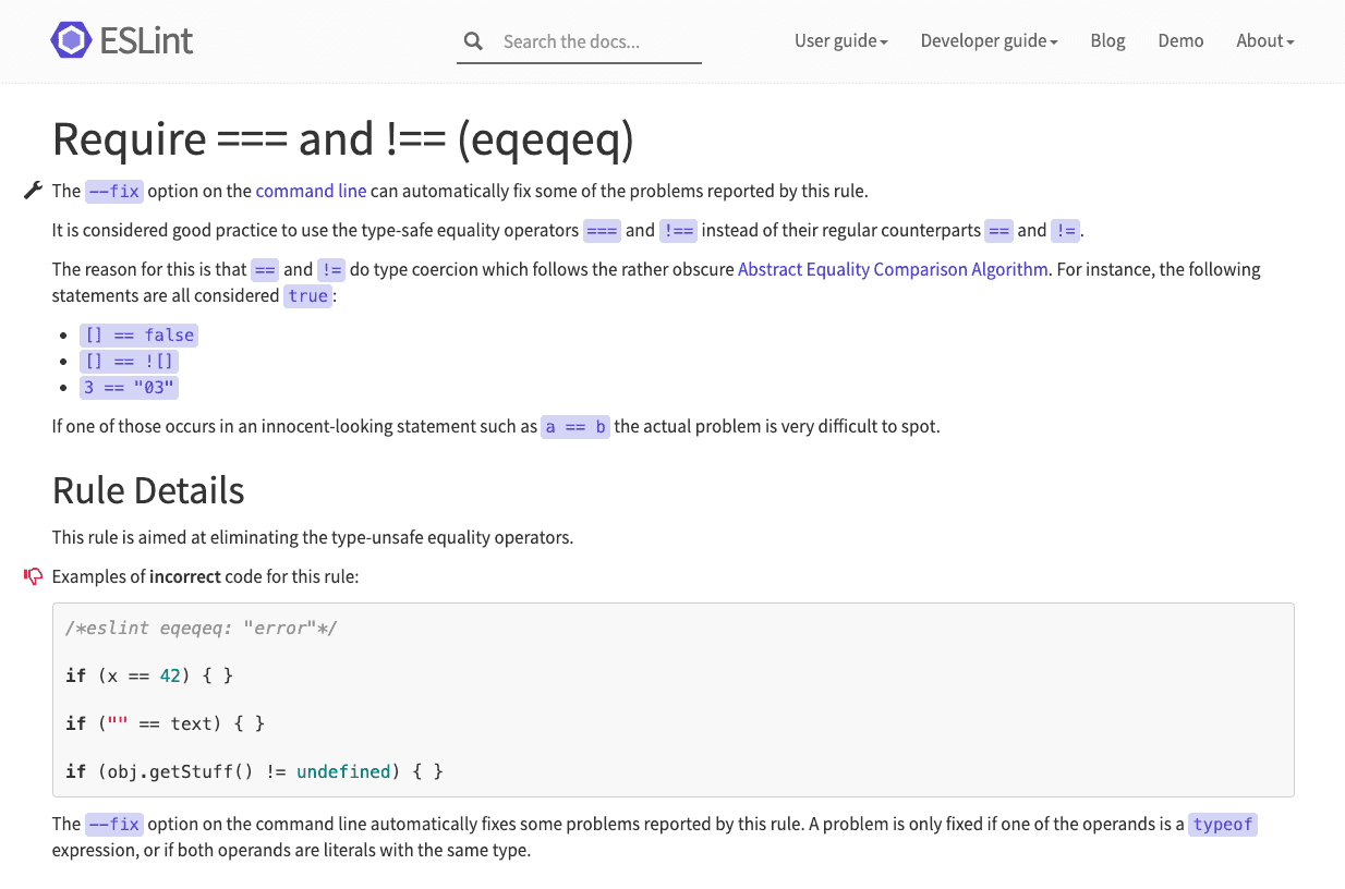 目前流行的程式碼分析工具Eslint, 都提供檢查程式碼是否要全面使用===代替==的規則,在React的開發包中便預設加入該規則。