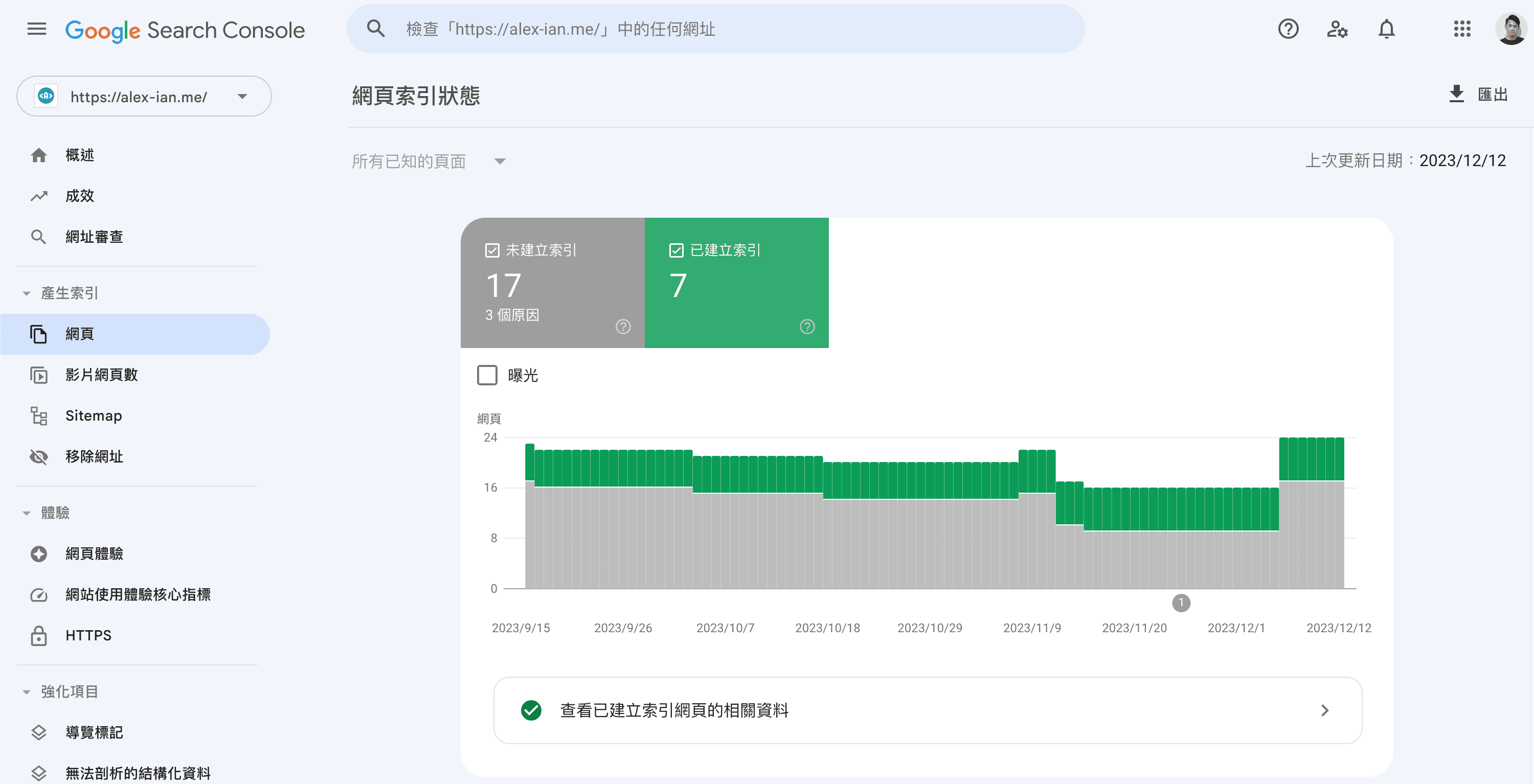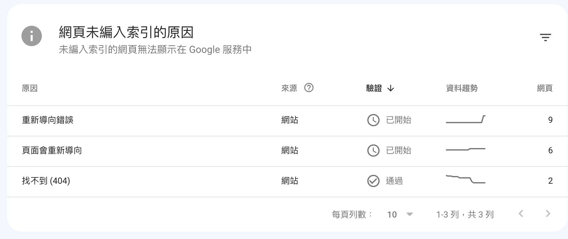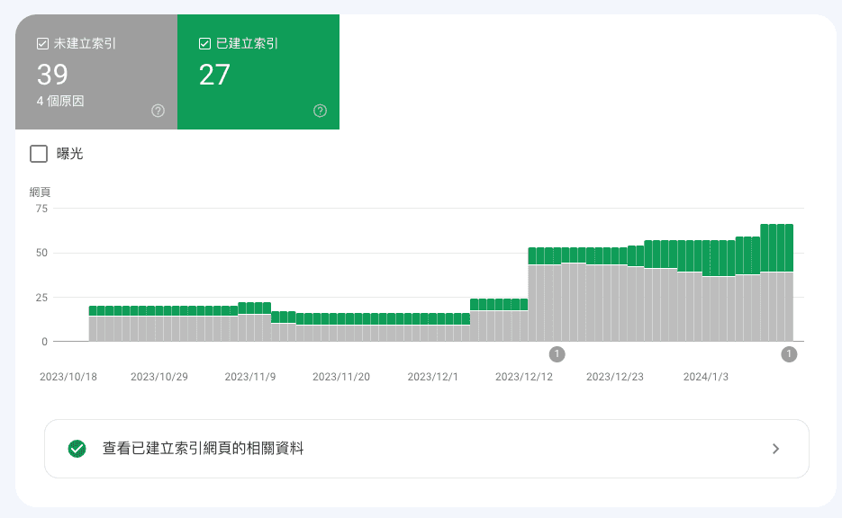 在 Google Search Console 點擊側選單的 產生索引 → 網頁,可以看到你整個網站頁面的索引狀態,除了可以看到成效外,也更易於找出需要改善的問題。