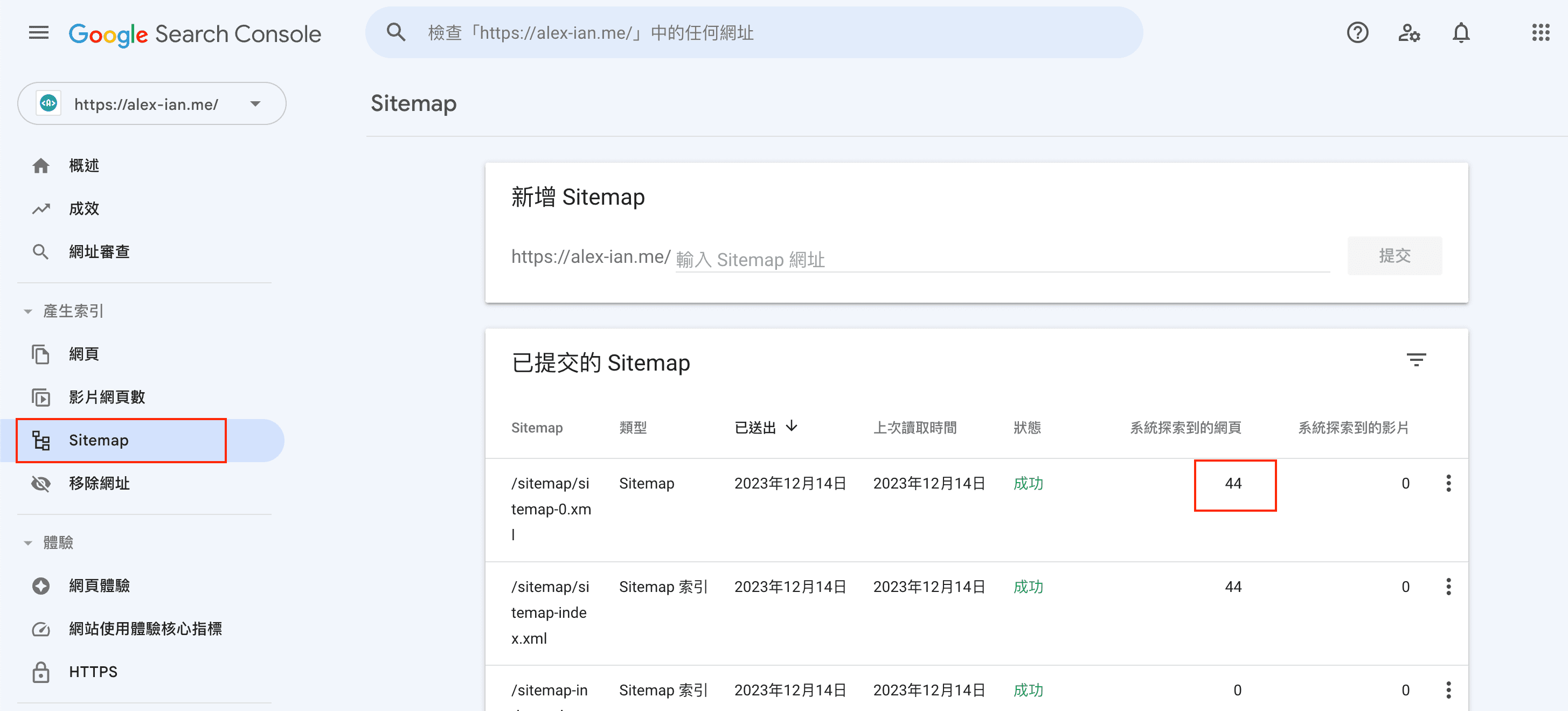 在 Google Search Console 提交後,可以在「已提交的 Sitemap」列表中,看到系統從 Sitemap 探索到的頁面數量,但要注意如果 Sitemap 內容較多時,Google 可能需要更多時間去讀取,且 Google 也並不保證必定會對列出的內容進行爬蟲,為此我們也可以嘗試手動加入索引。