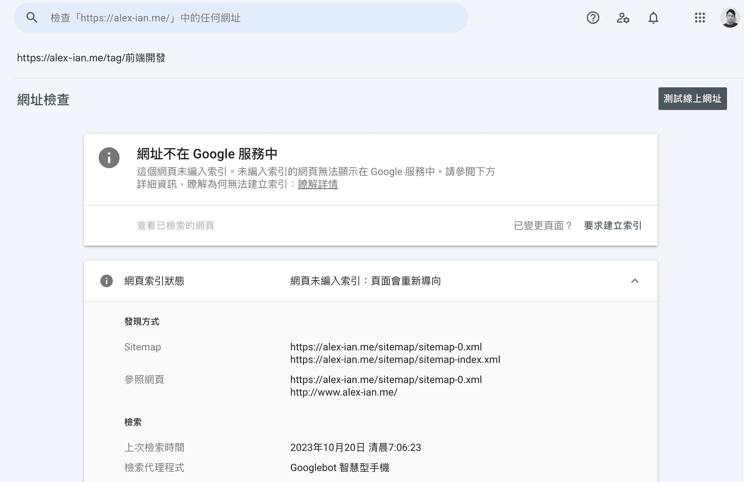 在 Google Search Console 的導覽列搜尋欄中輸入你的新文章網址後,會顯示該網頁在 Google 搜索引擎的狀態,假如顯示「網址不在 Google 服務中」,你可以嘗試根據其列出的原因進行修正,在修正後可點擊「要求建立索引」,讓 Google 為網址排入索引的隊列。至於什麼時候正式執行,則是端看 Google 了。