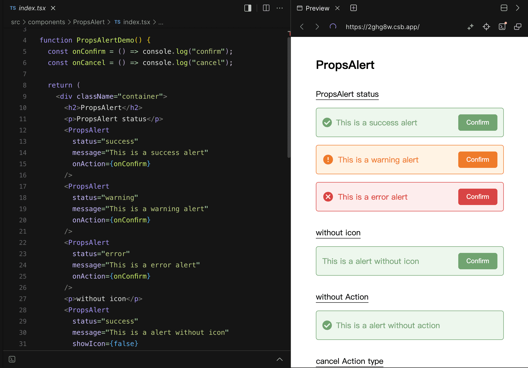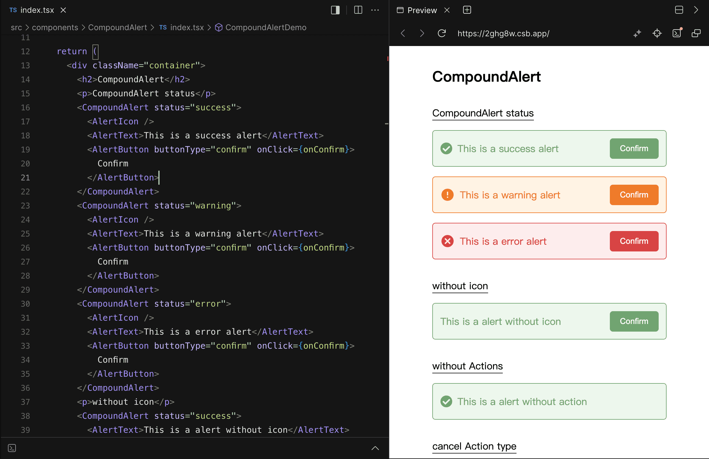 使用 Compound Component 模式建構的使用方式如下,雖然單純看使用方式,會認為其結構較 Props 模式來得更複雜,但相對在 JSX 架構下,可以看出其佈局,提升了可讀性,不再需要猜測 actionText、onAction 和 actionType 在 Alert 元件中的使用方式。