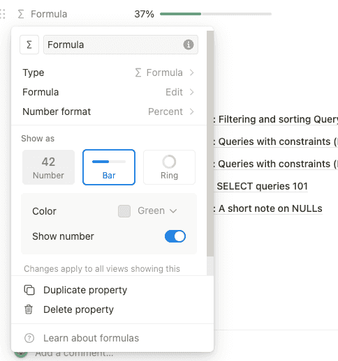 round((prop("子任務").filter(current.prop("done") == true).length() / prop("子任務").length()) * 100) / 100由於目前只有數字的呈現,要顯示進度條,我們需要調整該 Formula 的屬性,點擊欄位名稱 > 選擇 Edit Property: