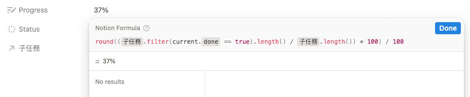 在卡上點擊 add a property > 選擇 formula 格式,它提供了類似 Excel 的簡單運算函式。首先我們要計算出完成的百分比,所以是 (完成的任務總數 / 所有任務總數) * 100% ,為了好看,我們只保留整數,其公式以及呈現如下: