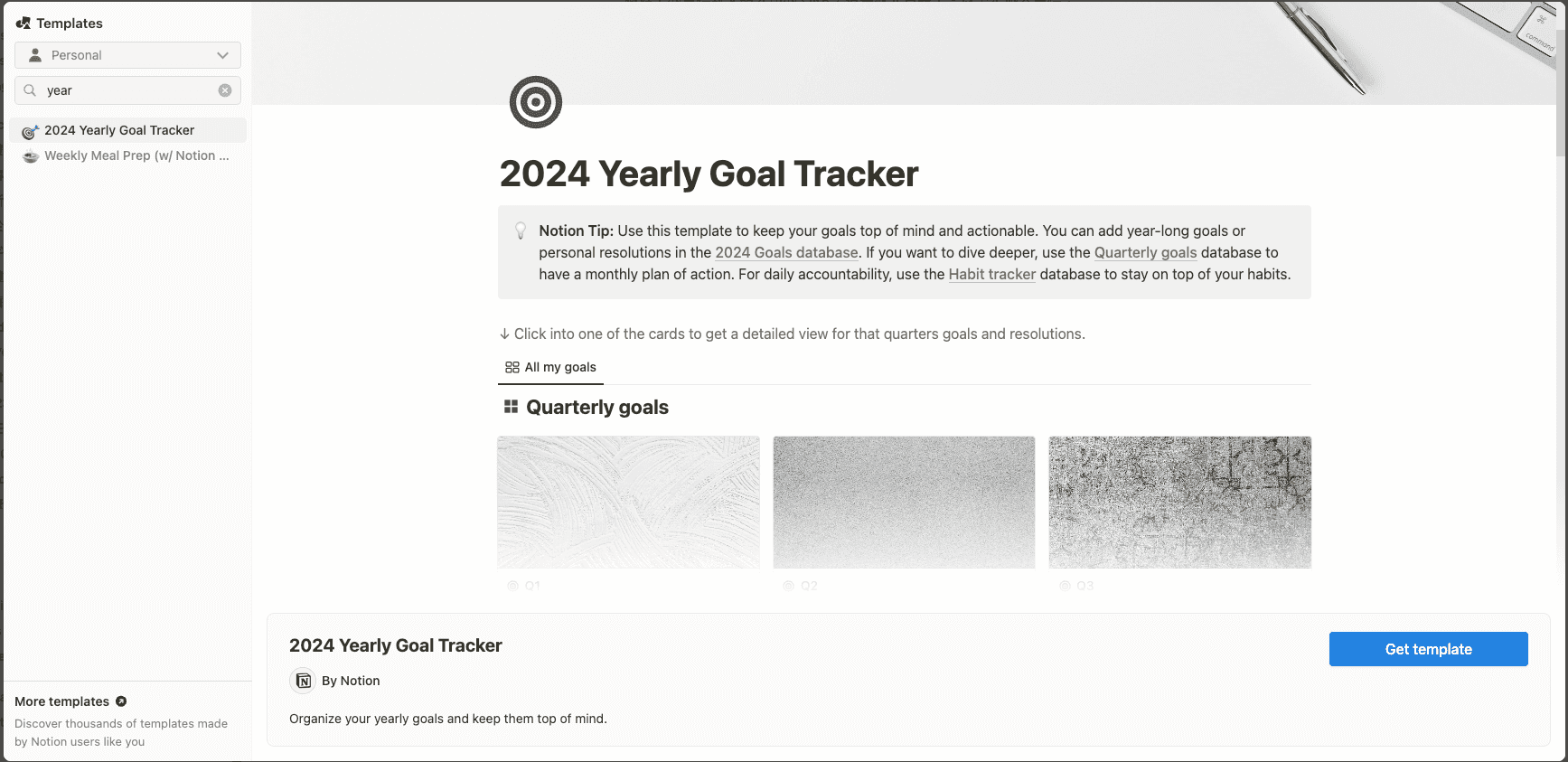 這次我首先使用 Notion 的 Yearly Goal Tracker 模版來追蹤自己的進度。模板中提供了兩種目標的進度追蹤,包含以季度進行的大目標,以及以行事曆方式記錄的每天進度。由於我會使用 iPhone 的待辦事項來做每天事項,所以我只有使用它季度進行的大目標的內容。